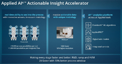 액셔너블 인사이트 액셀러레이터(Actionable Insight Accelerator)를 의미하는 AIx는 엔지니어들이 반도체 공정을 실시간 파악하고, 웨이퍼부터 개별 칩에 이르기까지 수백만 번의 측정을 거쳐 수천 개 공정 변수를 최적화할 수 있도록 해 ‘PPACt(전력·성능·공간비용·출시소요기간)’를 향상시킨다.