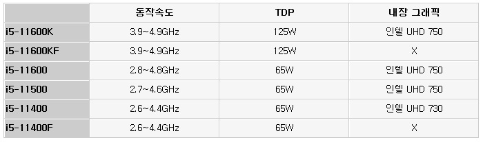 11600K 와 11600KF 는 오버클럭용 프로세서 이기 때문에 Z590 메인보드 사용이 필수적이며 125W 의 높은 TDP를 지원해 고성능 공냉 쿨러나 수냉쿨러를 장착해야 한다. 이에반해 11600 과 11500, 11400 & 11400F 는 오버클럭을 지원하지 않고 TDP도 상대적으로 낮아 메인보드 선택이 자유로운 편이며 중급형 쿨러 만으로도 충분히 열을 제어할 수 있다. 또한 F가 붙으면 그래픽을 지원하지 않기 때문에 외장 그래픽을 필수적으로 사용해야 한다.