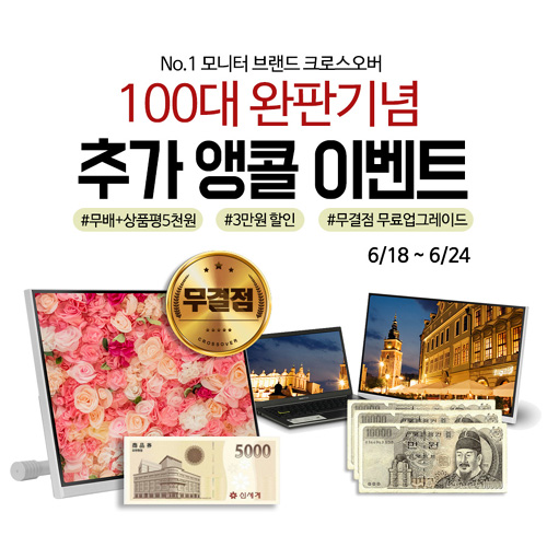 크로스오버가 23형 화면에 FHD 해상도를 적용한 모니터 ‘230FL75 IPSTYPE-C 터치 HDR 빅포터블’ 100대 완판을 기념하기 위해 네이버 스토어팜에서 추가 앵콜 이벤트를 실시한다.
