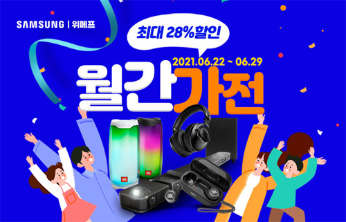 유니씨앤씨는 JBL의 음향기기를 대상으로 최대 28% 할인 혜택이 제공되는 ‘ 월간가전’ 프로모션을 위메프를 통해 2021년 6월 22일부터 29일까지 진행한다.