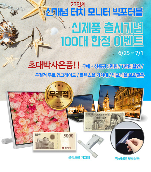6월 25일 금요일부터 7월 1일 목요일까지 열리는 이번 행사는 기존에 진행했던 이벤트와 방식을 바꿔 네이버 스토어팜 단독으로 진행하며 행사가 299,000원에서 추가 1만원 할인을 실시한다. 이때 2만원 상당의 전용 플렉시블 거치대와 1만원상당의 빅포터블 전용 보호필름도 무료로 증정한다. 행사는 선착순 100대 한정으로 진행되며, 무료로무결점 업그레이드해서 출고된다. 포토상품평 작성시 모바일 상품권 5,000원도지급하며, 고객의 부담을 덜기 위해 배송비는 무료로 발송된다.