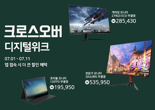 크로스오버존에서 포터블, 고해상도 및 게이밍 모니터들을 대상으로 7월 위메프 디지털위크 특가전을 진행한다. 행사기간동안 특별한 가격에 모니터 구매가 가능하다.