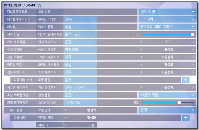 오버워치를 통해 실게임 테스트를 진행하고 있는 모습으로 중간 옵션에서 UHD 730은 60-83 프레임, UHD 750은 80-113 프레임으로 플레이가 가능한 것을 확인할 수 있었다. 50 프레임 정도에서 게임이 실행되었던 UHD 630 내장그래픽과는 확연한 성능차를 경험할 수 있을 것이다. (메모리는 듀얼채널 16GB)