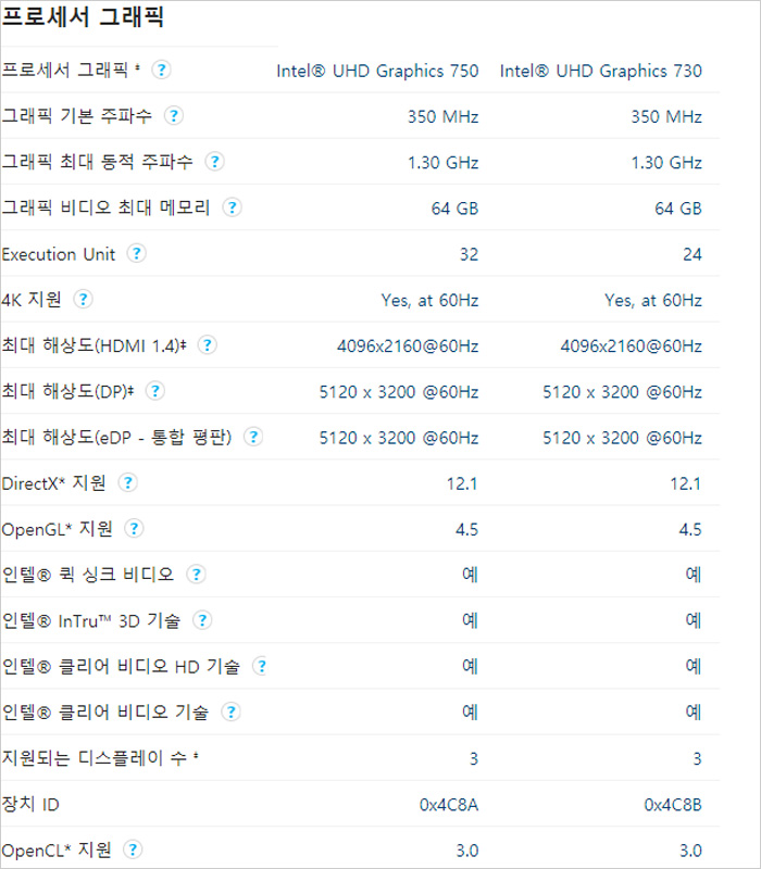 내장 그래픽의 모델명만 봐도 성능차가 있을 것이라는 것 쉽게 유추할 수 있을 것이다. 기본 주파수나 최대 동적 주파수 등은 동일하지만 멀티스레딩에 최적화된 컴퓨팅 프로세서인 Execution Unit 이 750 은 32, 730은 24로 성능차가 발생하게 된다.