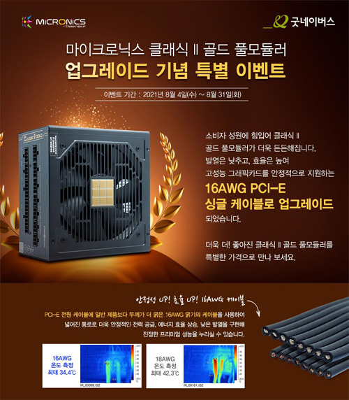 마이크로닉스는 ‘클래식 II 골드 풀모듈러’에 16 AWG PCI-E 싱글 케이블 업그레이드 적용을 기념, 한정 특가 이벤트를 진행한다.