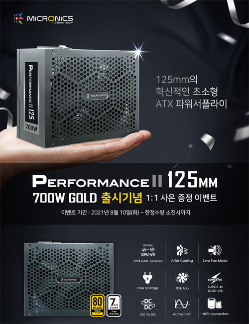마이크로닉스는 ATX 규격 파워서플라이 중 크기가 가장 작은 파워서플라이, ‘퍼포먼스 II 125mm 700W 80 PLUS GOLD’를 출시한다.