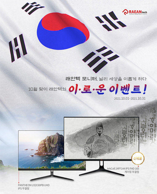 5천 원권 상품권 대상 모델은 FA2760CE, FA2760CE CB, Q2775CE CB, QA2760CE, QA2760CE 멀티스탠드 등 PANTHEON 시리즈 5종을 비롯하여 Q2775K, Q2775P(TN), Q2775P(IPS), QA2740P 등 EdgeArt 시리즈 4종, 그리고 RAC27FG165, RAC27CG165, 24FF144 등 ArkCell 시리즈 3종이다. 1만 원권 상품권 대상 모델은 U32CU60PB, U32CU60PW 등 PANTHEON 시리즈 2종과 Q3275K, QA3260K, Q3410P 등 EdgeArt 시리즈 3종이다. 더불어 M.2 NVMe SSD가 증정되는 포토후기 SNS 이벤트도 함께 진행된다. 참여 방법은 간단하다. 이벤트 대상 모니터 구매 후 인스타그램에 2장 이상의 모니터 사진을 등록하고 필수 태그와 함께 ‘raeantech’ 계정을 태그 하면 자동으로 응모가 완료된다. 11월 7일까지 등록을 완료한 구매자를 대상으로 추첨을 통해 3명에게는 ‘래안텍 RASSD620 M.2 NVMe SSD 1TB/512GB/256GB’이 용량별로 1개씩 증정된다. 당첨자는 11월 12일 오후 1시 유튜브 래안텍 공식 계정을 통해 라이브 방송을 통해 발표될 예정이다.
