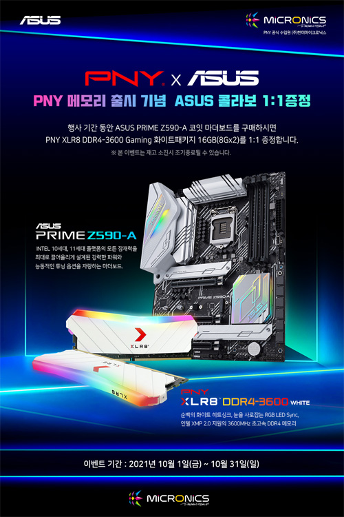 마이크로닉스는 PNY XLR8 Gaming DDR4 메모리 신제품 출시를 기념해 에이수스 컬래버레이션 1:1 증정 이벤트를 진행한다. 행사기간 중 에이수스 프라임 Z590-A 메인보드를 구매하면 PNY XLR8 게이밍 DDR4-3600 화이트 패키지 16GB 킷을 함께 제공한다.