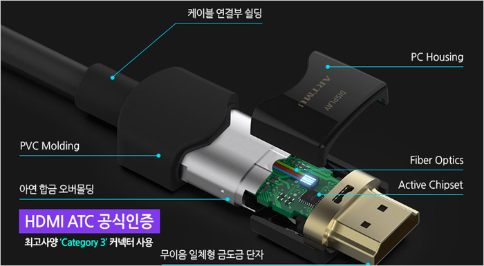 해상도와 대역폭, HDCP 등은 동일하지만 단자나 선재 등은 보급형과 중급형, 고급형이 다른 것을 확인할 수 있다. 특히 리뷰를 진행하는 AOC 모델의 경우 원거리 전송이 가능하도록 광케이블을 사용한 것이 가장 큰 특징이라 할 수 있다.