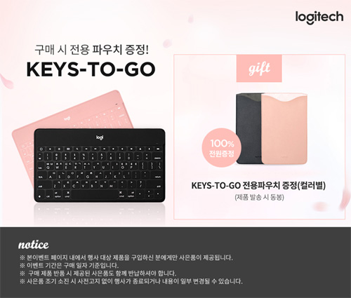 행사 제품 중 높은 휴대성과 부드러운 키 감의 블루투스 키보드 ‘로지텍 키즈투고(Logitech KEYS-TO-GO)’는 충전 식 배터리 적용으로 하루 2시간 기준, 완충 시 최대 3개월간 사용할 수 있다. 최신 스마트폰 보다도 얇은 6mm 두께, 180g의 초경량 울트라씬 키보드로 언제 어디든 편하게 작업을 할 수 있는 로지텍 키즈투고(Logitech KEYS-TO-GO)는 전용 스탠드를 제공해 아이폰, 아이패드 같은 터치 인터페이스 기반의 디바이스를 손쉽게 세워 둘 수 있다. 모던한 디자인과 슬림한 실루엣으로 팬데믹 이후 일상화된 하이브리드 업무 혁신에 큰 효율성을 보여주는 아이템으로 주목 받는 제품이다. 또한 무소음 타이핑이 가능하며 콤팩트한 사이즈에도 익숙한 키보드 레이아웃을 그대로 적용했다.