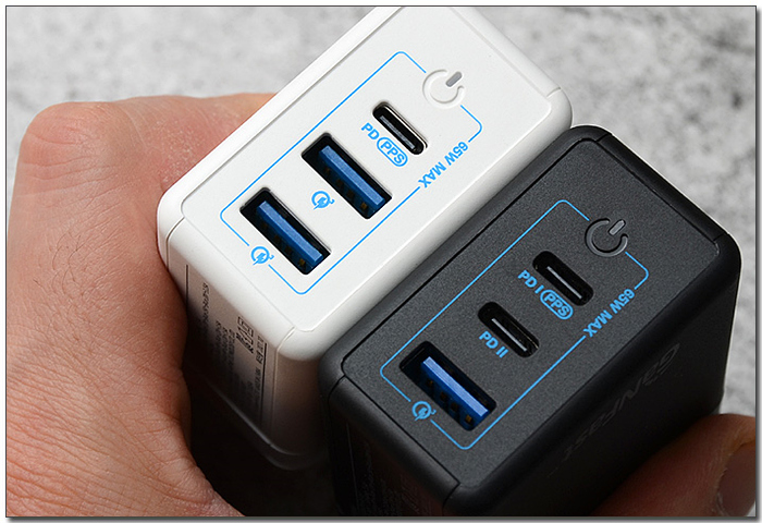 두제품 모두 65W를 지원하지만 단자 구성은 약간 다른 것을 확인할 수 있다. GE210 은 하나의 PD 충전 단자에 2개의 A타입 QC 3.0 단자를 지원하는데 반해 GE310 은 65W PD와 20W PD, A타입의 QC3.0 단자가 제공된다. (사용하는 디바이스의 성격에 따라 제품을 선택하면 된다.)