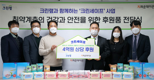 크린랲은 미세먼지 마스크 16만 장과 물티슈(16,800개), 하이퍼맥스 건전지(3,000개), 생리대(5,040개) 등 현물과 크린세이프 키트 제작 현금 등 총 4억원 상당의 현물과 현금을 국내외 취약계층 아동과 청소년들을 위해 기부하기로 하고, 23일 서울 마포구 소재 지파운데이션 사옥에서 기부물품 전달식을 가졌다고 밝혔다.