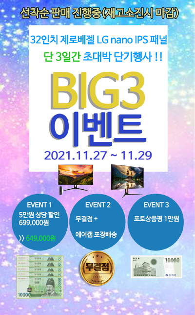 먼저 11월 27일(토)부터 29일(월)까지 선착순 30대 한정으로 진행되는 32UL999 DCI-P3 98 TYPE-C 4K PREMIUM 멀티스탠드 행사는 699,000원에 판매되는 무결점 모델을 기존보다 5만원 할인된 649,000원에 특가 판매되며, 특전 사은품으로 무료배송과 외부 충격 방지를 위해 고급 에어포장을 실시해 배송한다. 또한 포토상품평 작성시 신세계 상품권 10,000원을 증정한다.