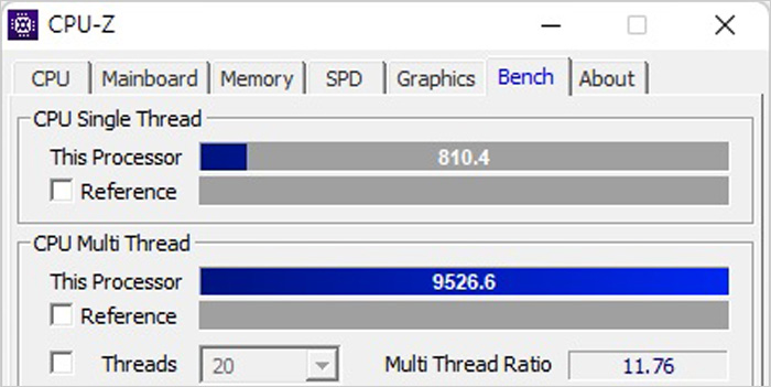 테스트를 위해 PC를 조립한 후 바이오스에 진입한 모습으로 CPU 가 정상적으로 인식되는 것을 확인할 수 있었다. (배수락이 해제된 CPU 답게 원터치 오버클럭 기술인 게임부스트가 활성화 되며 튜닝램을 사용할 경우 XMP 프로파일 선택도 가능하다.) 또한 윈도우 11 설치후 장치관리자에 진입했을 때 정상적으로 20스레드가 인식되는 것을 확인할 수 있었다.