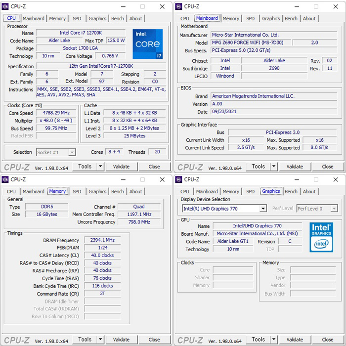 CPU-Z를 이용해 프로세서의 정보를 확인하고 있는 모습으로 10nm의 인텔 7 공정으로 제작된 것을 확인할 수 있으며 상단에서 언급한 것과 같이 8+4코어에 20스레드로 구성된 것을 확인할 수 있다. 또한 12MB의 L2캐시가 제공되며 L3캐시는 25MB를 지원한다.