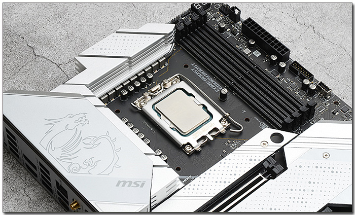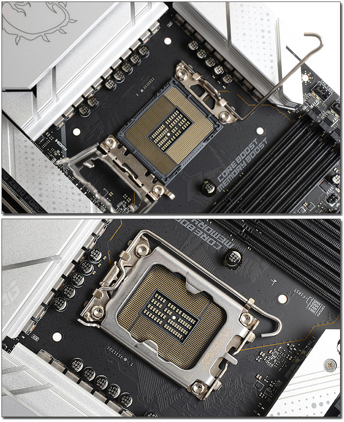 CPU 장착을 위한 소켓의 모습으로 LGA 1700 규격에 맞게 직사각형으로 디자인된 것을 확인할 수 있으며 규격에 맞게 홀이 설치되어 LGA 1700 브라켓을 장착한 공냉& 수냉 쿨러를 장착해 사용할 수 있다. 걸쇠를 풀어 가이드를 들어 올린 후 CPU와 가이드의 삼격을 맞춘 상태에서 CPU를 조립한 후 가이드를 내리고 걸쇠를 채워주면 CPU 장착이 완료된다.