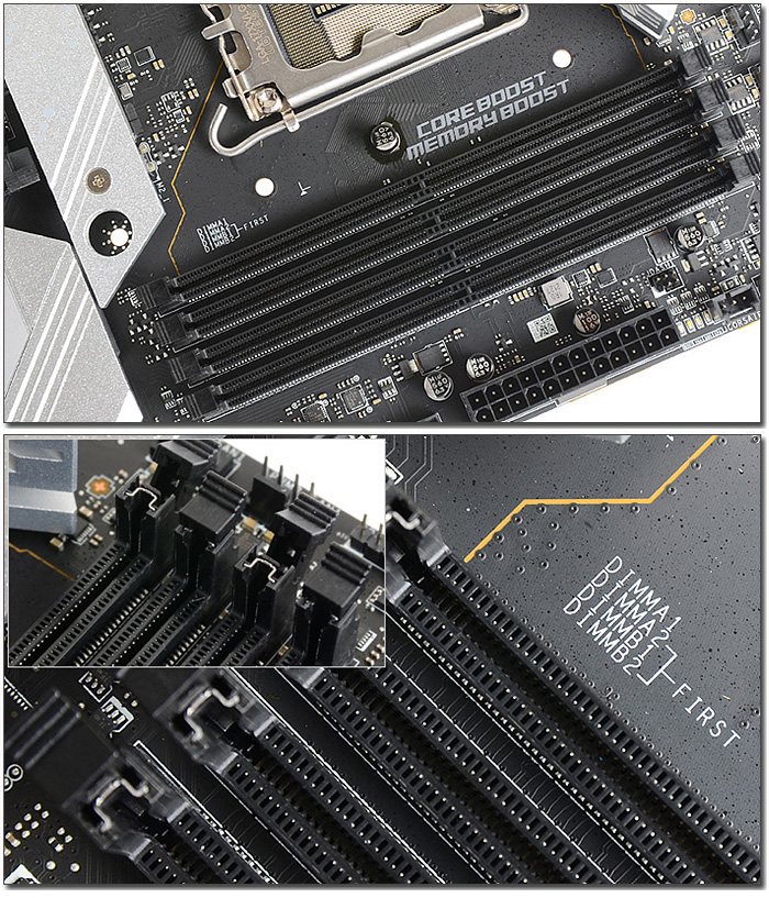 메모리 슬롯의 모습으로 Z690칩셋이 장착된 고급형 메인보드 답게 4개의 슬롯을 제공하며 양 측면에 부착된 가이드가 모두 오픈되도록 설계되어 편하게 메모리를 탈부착 할 수 있다. (메모리 장착 우선순위가 메인보드에 프린팅 되어 듀얼채널 구성시 빠르게 메모리를 장착할 수 있다.)