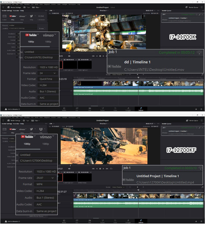 영상편집 S/W 인 다빈치 리졸브를 이용해 랜더링 테스트를 진행했을 때 (640MB, 920MB, 990MB 4K 동영상을 단일 동영상으로 랜더링, FHD 해상도에 H.264 비디오 코덱) 5분 12초가 소요되었던 i7-11700K와 달리 i7-12700KF 는 3분 10초가 소요되었다. 1시간 이상의 영상을 편집하고 랜더링 작업을 할 경우 더 확연한 시간차이를 경험할 수 있을 것이다. (참고로 i9-12900KF에서는 2분 59초가 소요되었다.)