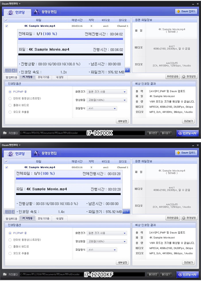 동영상 인코딩 프로그램을 이용해 인코딩 시간을 확인한 모습으로 30초 이상 시간이 단축된 것을 확인할 수 있다. 촬영된 영상을 변환해야 할 경우 짧은 시간에 변환작업을 마칠 수 있을 것이다.
