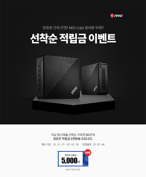 2021년 12월 27일부터 2022년 1월 31일까지 한정 수량으로 진행되는 이번 행사는 ‘MSI 큐비5 C5205U’ 구매자 선착순 50명에 컴퓨존 적립금 5,000원을 증정한다.