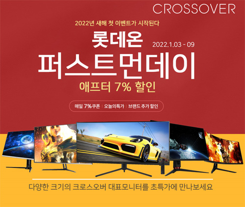 크로스오버는 자사의 인기 게이밍 모니터 22종을 대상으로 롯데온 2022년 새해 퍼스트먼데이, 애프터 7% 할인 특가전을 진행한다.