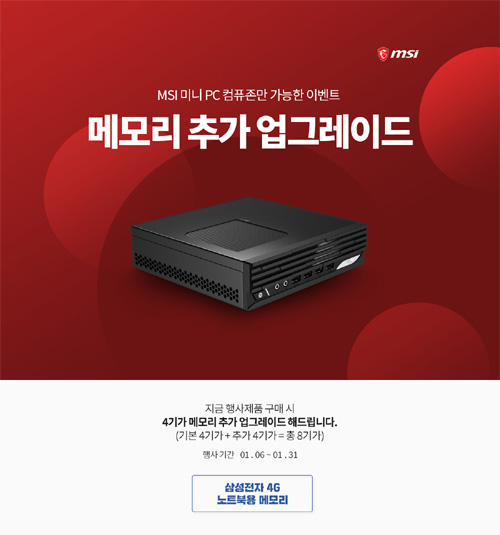 2022년 1월 6일부터 2022년 1월 31일까지 한정 수량으로 진행되는 이번 행사에서 MSI는, ‘MSI 미니 DP21’의 구매자 전원을 대상으로 삼성 4G 메모리를 100% 증정한다. 이를 통해, 기본 제공되는 4GB 메모리에 추가 4GB를 더한 8GB 메모리를 탑재, 메모리 추가 구매의 부담없이 쾌적한 컴퓨팅 환경을 구현할 수 있다.