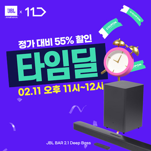 유니씨앤씨는 2022년 2월 십일절을 맞이하여 드라마, 영화를 실감나게 감상할 수 있는 JBL BAR 2.1 사운드바를 대상으로 파격적인 할인과 무료 설치 배송 혜택이 제공되는 ‘타임딜’ 프로모션을 11번가를 통해 2022년 2월 11일 오후 11시부터 12시까지 한 시간 동안 진행한다.