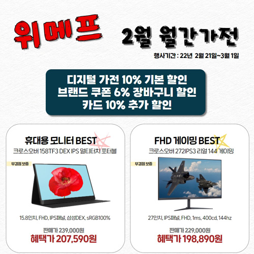 크로스오버는 자사의 인기 게이밍 모니터 26종을 대상으로 위메프 2월 월간가전 특가전을 실시한다.