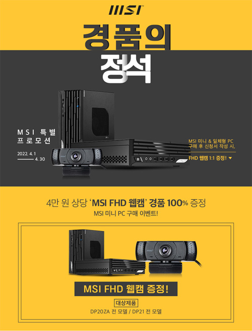 4월 30일까지 진행하는 이번 이벤트는 MSI의 미니PC 또는 일체형PC를 구매한 후 지정된 양식에 맞춰 신청서 작성 시 FHD 웹캠을 증정한다. 대상제품은 인기 미니PC인 ‘MSI 미니 DP20ZA 시리즈’ 및 ‘MSI 미니DP21 시리즈’와 일체형PC ‘MSI 프로 24X 시리즈’이다.