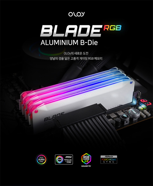 이번에 새롭게 선보이는 올로와이 DDR4-3600 BLADE CL14 모델은 뛰어난 성능과 안정성으로 인기가 많은 삼성 B-다이 메모리를 기반으로 제작된 제품으로 높은 수준의 퍼포먼스는 물론 뛰어난 오버클럭 성능을 자랑한다. 뛰어난 성능에 걸맞게 고성능 메모리에서 발생하는 발열을 효과적으로 해결하기 위해 알루미늄 히트 싱크로 제작되었다. 특히 ‘블레이드(BLADE)’라는 이름에서 알 수 있듯이 검의 모양을 본떠서 제작된 방열판 디자인은 올로와이 메모리의 정체성을 보여주는 대표 디자인으로, 가장 많은 인기를 얻고 있다. 제품 상단에는 튜닝 효과를 낼 수 RGB LED 상태 등이 적용되어 있으며, 유명 메인보드 제조사의 RGB 싱크를 지원해서 원하는 색상과 효과를 손쉽게 적용할 수 있다.