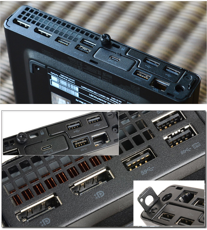 기기 후면부의 모습으로 2개의 DP 단자가 설치되어 멀티 디스플레이 활용이 가능하며 유선랜 연결을 위해 이더넷 단자가 제공된다. 또한 2개의 USB 3.2 Gen1 과 USB 2.0 단자 지원으로 손쉽게 주변기기를 연결할 수 있으며 전원 단자가 측면에 설치된 것도 확인할 수 있다. 또한 도난 방지를 위한 시큐리티 홀이 중앙에 설치되어 있고 상판을 오픈해 내부 부품을 탈취하거나 교체하지 못하도록 슬라이딩 방식의 락홀을 측면에 설치했다. (측면의 쇠를 당기면 튀어 나오면서 Lock이 걸린다.)