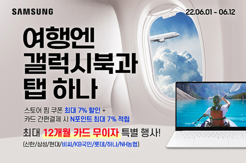 여행엔 갤럭시북과 탭하나” 행사 기간 중 갤럭시북2 프로 360(NT950QEW-A51A)와 갤럭시북2 프로 15형(NT950XEE-X71A), 갤럭시북2 프로 13형(NT930XEW-A51A), 갤럭시북(NT761XDZ-G78A)등 삼성노트북 인기 모델 구매 시 행사 특별 할인 최대 61만원과 N PAY 포인트 최대 26만 적립 혜택, 카드 무이자 혜택까지 받아 볼 수 있다. 추가로 쇼핑라이브 특가 방송 시간 내 구매 시 전용 노트북 파우치, 삼성 정품 블루투스 마우스와 라이브 방송 중 퀴즈 이벤트를 통해 다양한 사은품까지 함께 제공 될 예정이다.