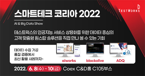 테스트웍스는 6월 8일(수)부터 10일(금)까지 3일간 서울 코엑스에서 개최되는 ‘스마트테크 코리아 2022(SMARTTECH KOREA 2022)’의 주요 행사인 ‘인공지능&빅데이터쇼 2022(AI&Big Data Show2022)’에 참가한다고 밝혔다.