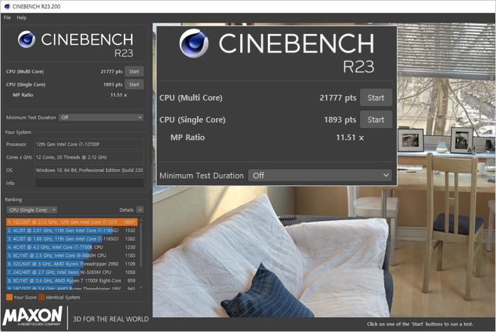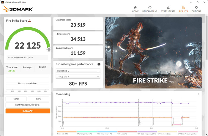12세대 인텔코어 i7-12700F에 구형 그래픽카드인 RTX 2070을 장착한 상태에서 벤치마크 테스트를 진행한 모습으로 최상급 까지는 아니지만 대부분의 게임을 부드럽게 즐길 수 있는 높은 스코어를 보여주는 것을 확인할 수 있다.