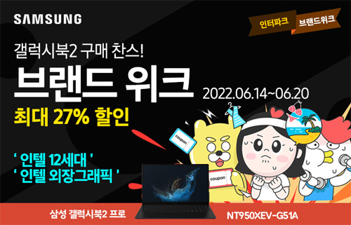 유니씨앤씨는 최신 인텔 12세대 CPU와 인텔 아크 그래픽 탑재, 초슬림 초경량 디자인으로 뛰어난 휴대성을 자랑하는 삼성 갤럭시북2 프로 NT950XEV-G51A 모델을 대상으로 최대 48만원 중복 할인과 푸짐한 사은품이 증정되는 ‘브랜드위크’ 프로모션을 2022년 6월 14일부터 6월 20일까지 인터파크를 통하여 단독 진행한다.