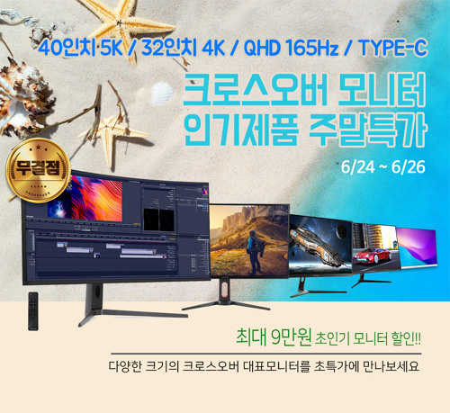 이번 행사동안 크로스오버의 빅포터블, 24, 27, 32, 40형 등 다양한 모니터들이 저렴하게 판매된다. 행사기간은 6월 24일 금요일부터 26일 일요일까지 진행되며 크로스오버의 다양한 제품들을 저렴한 가격에 만나볼 수 있다. 포토상품평 이벤트도 진행돼 간단하게 상품평을 작성하고 상품권도 받아갈 수 있다.