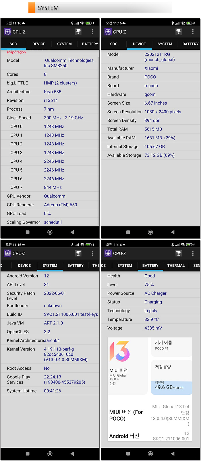 이 제품에 사용되는 스냅드래곤 870은 낮은 소비전력으로 구동되어 발열을 최소화 하면서도 강력한 처리성능을 지원해 일반적인 사용은 물론 게임용도로도 활용할 수 있다. 프라임과 골드, 실버코어로 구성된 옥타코어 기반으로 구성되어 있으며 퀄컴 Adreno 650 GPU가 적용되어 고성능을 필요로 하는 게임도 충분히 구동할 수 있다. 또한 X55 5G 모뎀을 탑재해 5G 기능을 활용할 수 있다. 최신 제품답게 안드로이드 12가 설치되어 있으며 전용 OS인 MIUI 또한 13으로 셋팅된 것을 확인할 수 있다.