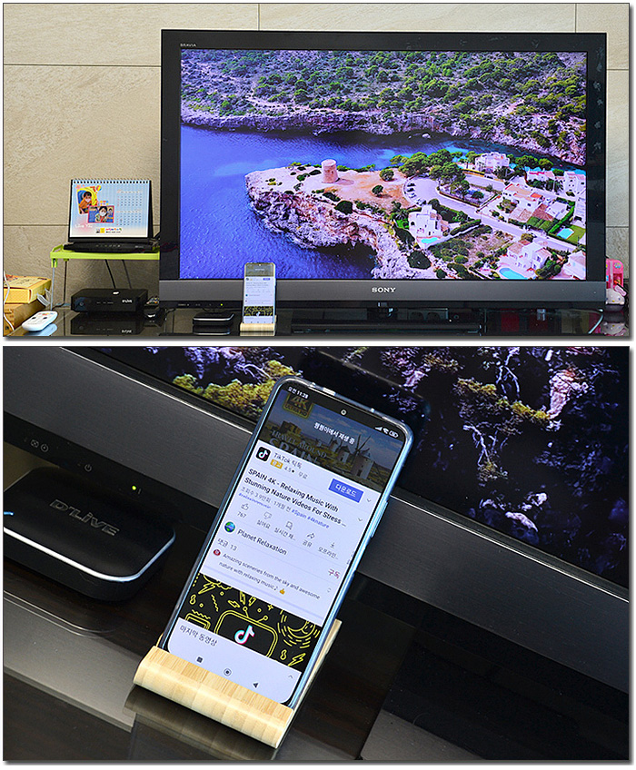 미러링 기능을 지원하지 않아 유선 연결은 불가하지만 크롬 캐스트를 지원해 대화면으로 유튜브 영상을 즐길 수 있었다. (TV에 OTT 기기가 설치되어 캐스트 기능을 사용하는데 문제는 없었다.) 상단의 사진은 유튜브 영상을 TV에서 시청하고 있는 모습으로 원할하게 작동되는 것을 확인할 수 있었다.