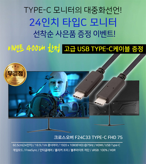 크로스오버가 24형 USB TYPE-C 모니터 ‘F24C33 TYPE-C FHD 75’를 대상으로 USB TYPE-C 케이블 무료 증정행사를 펼친다. 7월 11일 월요일부터 선착순으로 진행되는 이번 행사는 준비된 사은품 USB TYPE-C 케이블 400개 소진시까지만 진행된다.