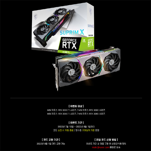 경품은 NVIDIA DLSS와 실시간 레이 트레이싱이 적용되어 화려한 이펙트가 인상적인 '고스트와이어: 도쿄’와 리플렉션 기능이 추가되어 빠른 액션과 화려한 게이밍 비주얼을 자랑하는 ‘둠 이터널’ 게임 코드이다. 또한, 고대의 신 파트1과 파트2로 구성된 ‘둠 이터널 이어 원 패스’까지 포함되어 총 4개의 게임 코드를 증정한다. ‘MSI 지포스 RTX 3090 Ti / 3090 / RTX 3080 Ti / RTX 3080 시리즈’ 그래픽카드를 202년 7월 12일부터 2022년 8월 1일까지 구매하는 고객은 게임 코드를 받을 수 있으며, ‘엔비디아 지포스 익스피리언스’를 통해 게임으로 교환할 수 있다.