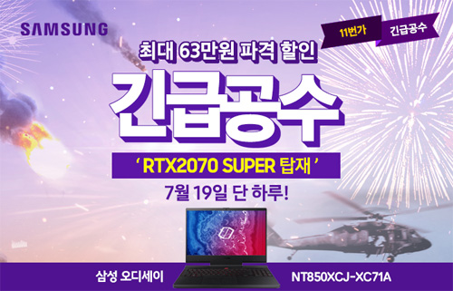 유니씨앤씨는 여름휴가 시즌을 맞아 인텔 10세대 i7 헥사코어와 지포스 RTX 2070 Super 외장그래픽이 탑재되어 극강 게이밍 퍼포먼스를 선사하는 삼성 오디세이 NT850XCJ-XC71A 모델을 대상으로 최대 63만원 파격 할인되는 ‘긴급공수’ 프로모션을 2022년 7월 19일 단 하루 11번가를 통하여 단독 진행한다.