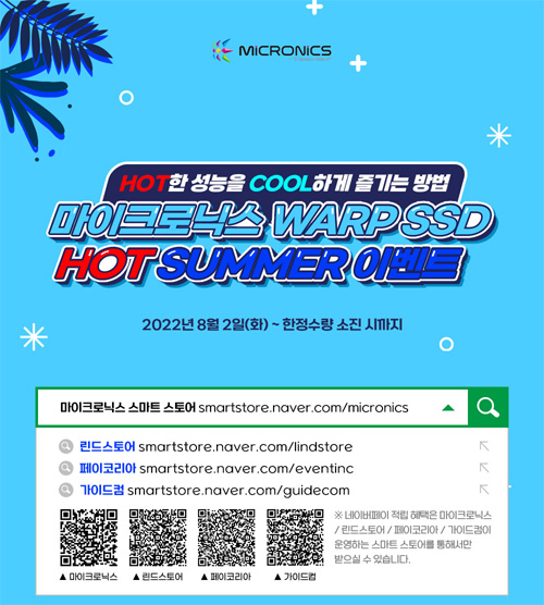 마이크로닉스는 자사의 고속저장장치 제품군인 ‘워프 SSD(WARP SSD)’를 구매한 소비자를 대상으로 구매처, 제품에 따라 네이버페이 포인트 및 워프 C1 방열판 등을 제공하는 ‘마이크로닉스 워프 SSD 핫 서머(Hot Summer) 이벤트’를 진행한다.