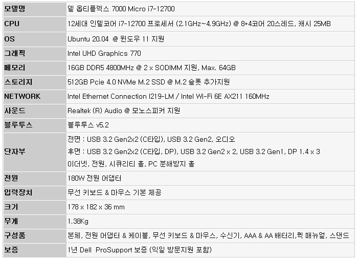 이번에 리뷰를 진행 할 델 옵티플렉스 7000 Micro i7-12700 는 기존 미니PC의 단점으로 지적되던 성능과 확장성을 개선한 최고급형 제품으로 하이브리드 아키텍처를 적용해 성능을 한층 끌어올린 12세대 인텔코어 i7-12700을 탑재했으며 16GB DDR5 메모리와 512GB PCIe 4.0 NVMe SSD가 장착되어 문서작업 등의 캐주얼한 용도 뿐만 아니라 높은 성능을 필요로 하는 전문작업용으로 사용할 수 있다.