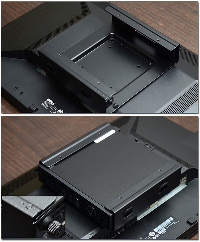 모니터 스탠드가 하단에 설치되어 있을 경우 사진과 같이 커버를 분리해 사용하면 된다. 브라켓과 PC를 고정하는 손나사가 설치되어 안정적으로 PC를 장착할 수 있다.