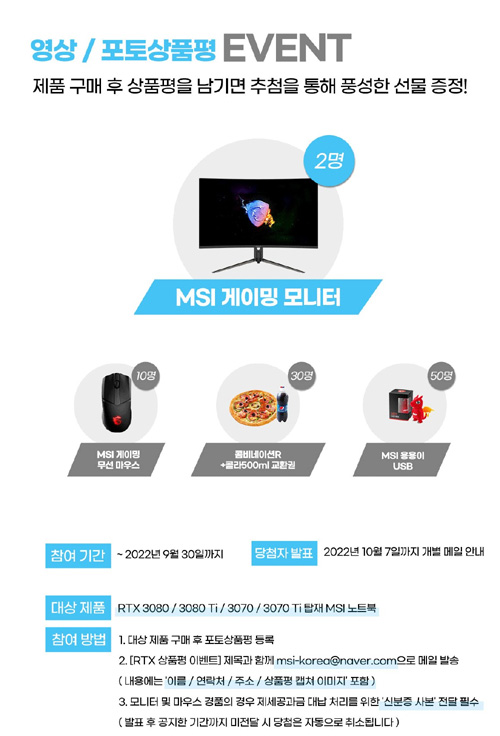 11번가에서 진행되는 이번 기획전은 RTX 3080/ 3080 Ti/ 3070/ 3070 Ti을 탑재 MSI 노트북을 대상으로 제품별 최대 20% 중복 쿠폰 및 5% 카드 할인 등 푸짐한 혜택을 제공한다. 특히 9월 30일(수)까지 해당 기획전 제품들을 대상으로 영상 및 포토상품평 이벤트를 실시한다. 참여 방법은 [RTX 상품평 이벤트] 제목과 함께 '이름, 연락처, 경품 수령 주소, 상품평 스크린샷'을 포함하여 접수 메일 ( msi-korea@naver.com )로 발송하면 된다. 당첨자 발표는 10월 7일(금)까지 개별 메일로 통보되며, 추첨을 통해 MSI 게이밍 모니터(2명) 및 게이밍 무선 마우스(10명), 피자&콜라 세트(30명) 등 다양한 경품이 발송된다.