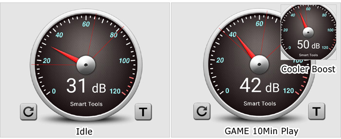 팬소음 테스트를 진행하고 있는 모습으로 아이들이나 캐주얼한 작업에서는 생활소음에 묻혀 팬소음이 거의 들리지 않았으며 게임을 실행하면 4개의 팬이 빠르게 동작해 팬소음이 커지기는 하지만 생각보다 크지 않았다. 또한 팬이 최대 속도로 동작하는 쿨러부스트를 실행하면 50dB 정도까지 팬소음이 커지는 것을 확인할 수 있었다. (쿨러부스트를 실행하면 팬소음이 커지는 만큼 빠르게 열을 식혀준다.)