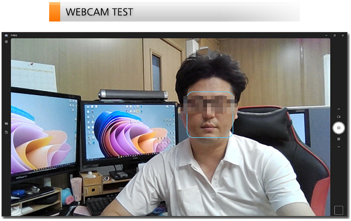 HD 웹캠의 화질을 확인하고 있는 모습으로 어두운 실내임에도 밝고 선명한 영상을 보여주었다. 화상회의나 게임방송, 셀프촬영 등의 용도로 충분히 사용할 수 있을 것이다.