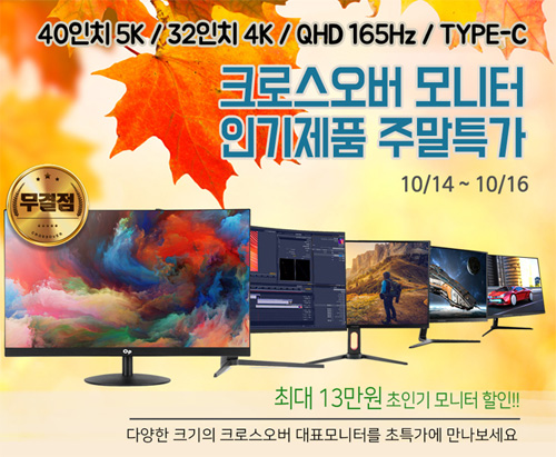 크로스오버는 자사의인기 포터블, 게이밍, 고해상도 모니터들을 대상으로 네이버 주말 특가전을 펼친다고 밝혔다. 이번 행사동안 크로스오버의 빅포터블, 24, 27, 32형 등 다양한 모니터들이 저렴하게 판매된다.