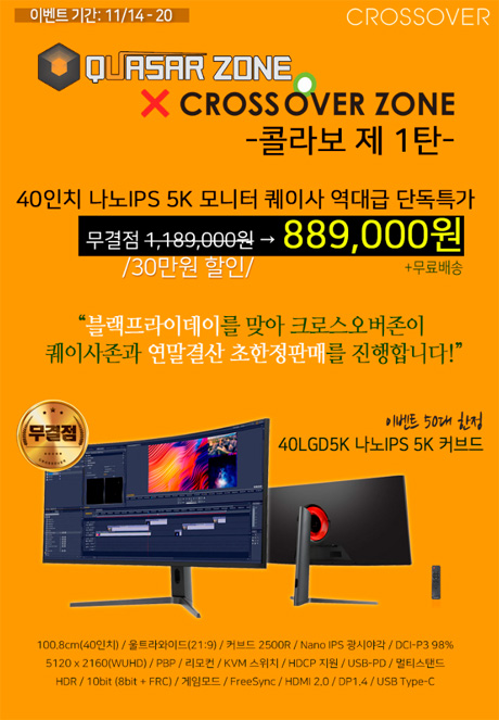 크로스오버는 40형 5K 초고해상도 커브드 모니터 ‘40LGD5K 나노IPS 5K 커브드’를 대상으로 퀘이사존과 함께 연말결산 초한정판매를 진행한다.