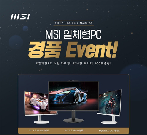 MSI는 일체형PC(All-In-One PC) 구매 고객 대상에게 게이밍 모니터 증정 행사를 진행한다. 사은품 증정 행사는 2022년 11월 14일부터 12월 13일까지 한 달간 진행, 행사기간 동안 MSI 일체형PC 구매 시 14만원 상당의 인기 게이밍 모니터 ‘MSI MP241X 프로’를 1:1 무료 증정한다. 대상 모델에는 MSI 일체형PC 전 제품이 포함되며, 크게 ‘MSI 프로 AP241’시리즈와 ‘MSI 프로 MP242’시리즈 모델로 살펴볼 수 있다.